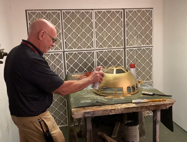 R2-D2 is in full production! The Electronics Engineering Technologies Shop is building a full scale operating R2-D2 Droid. Mr. Linehan stopped by today and added a coat of paint to the dome, of course our R2 will be in the school colors!!! Thank you OC Carpentry for letting us use your paint booth!